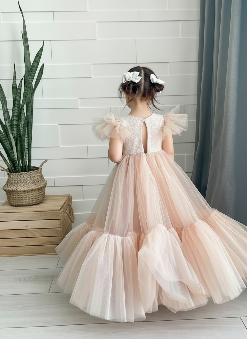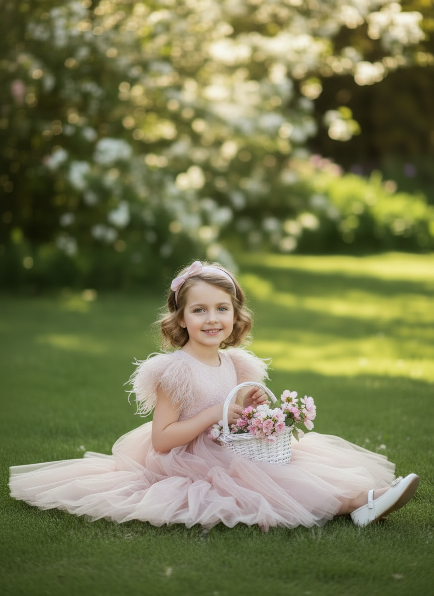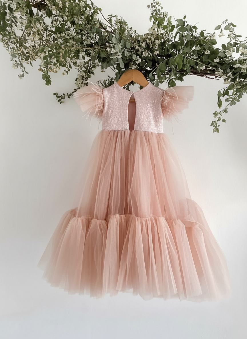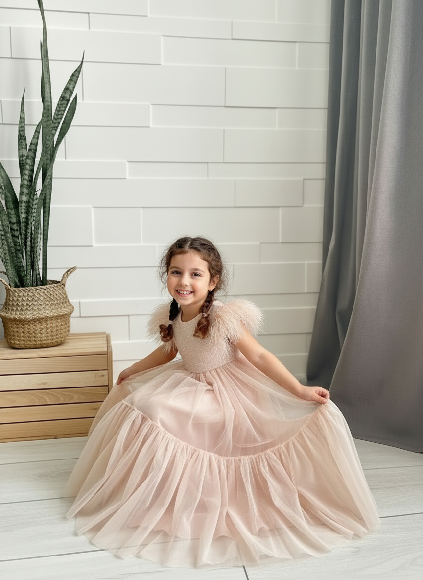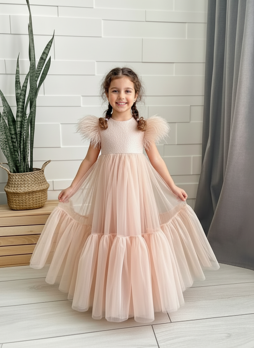 Zartes Kleid für eine kleine Prinzessin mit luftiger, mehrlagiger Tüllrock und eleganten, dekorativen Federärmeln. Das strukturierte Oberteil und der voluminöse Tüll verleihen eine märchenhafte Silhouette – perfekt für Feste, Fotoshootings und besondere Anlässe.