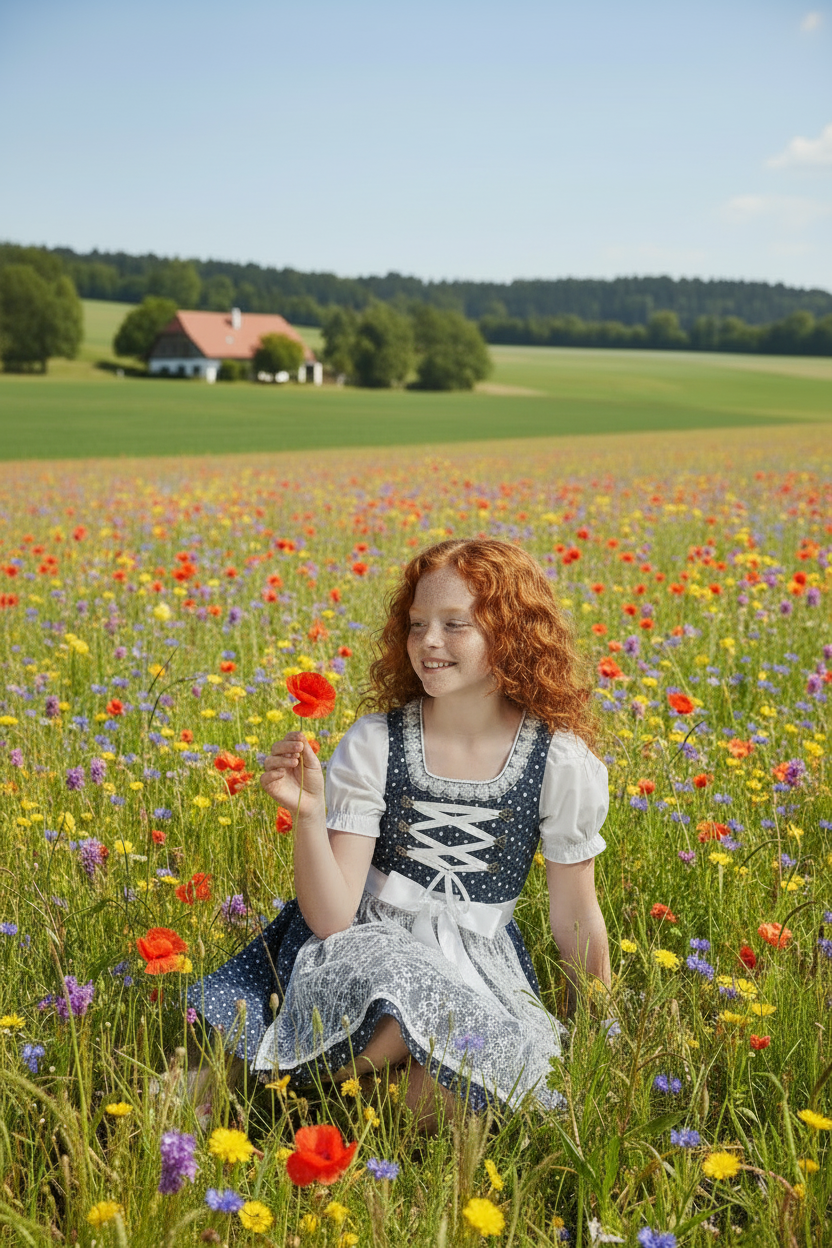 Dieses wunderschöne Kinder-Dirndl aus reiner Baumwolle verbindet klassische Trachtenoptik mit hohem Tragekomfort. Das zeitlose Design in Blau und Weiß mit feiner Spitze macht es zum perfekten Begleiter für festliche Anlässe und warme Tage.