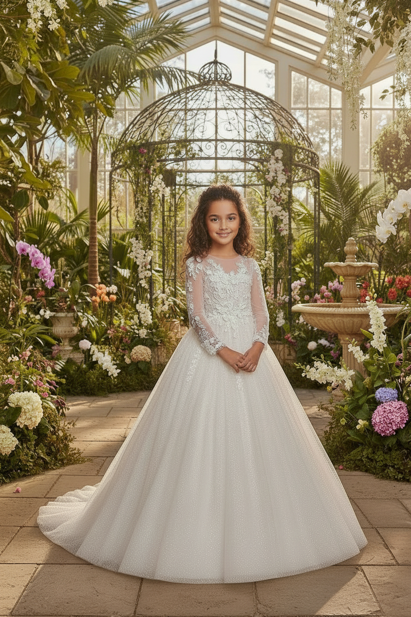 Dieses traumhafte Kleid vereint klassische Eleganz mit romantischen Details. Das Oberteil ist mit feiner Spitze verziert und verfügt über transparente Ärmel, die dem Design eine besonders edle und zarte Ausstrahlung verleihen. Der weit fallende Rock aus hochwertigem Tüll sorgt für eine majestätische Silhouette und einen unvergesslichen Auftritt.